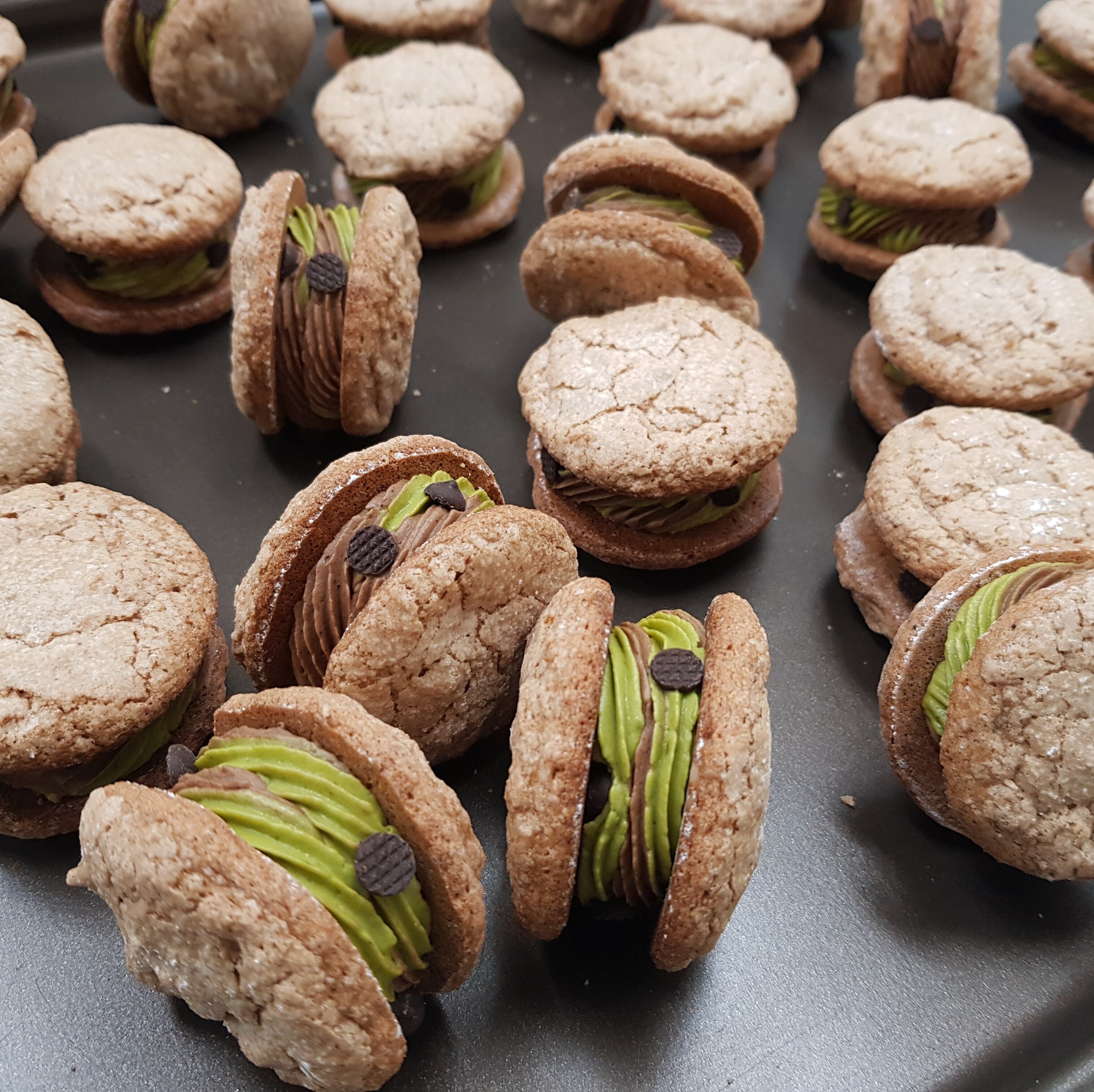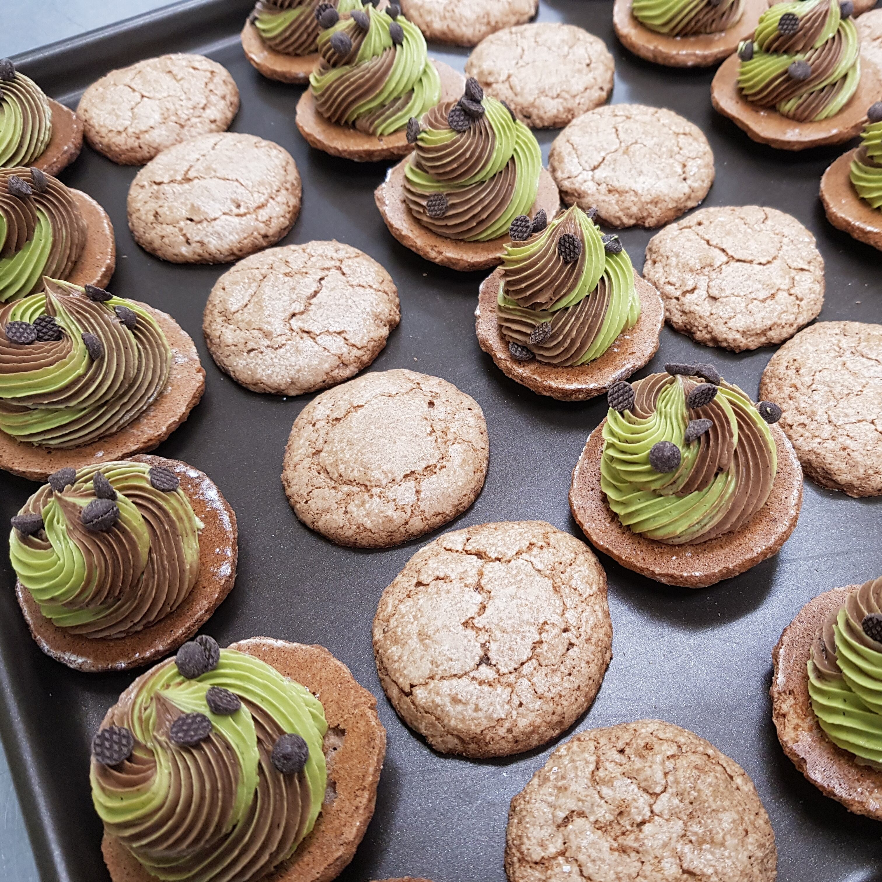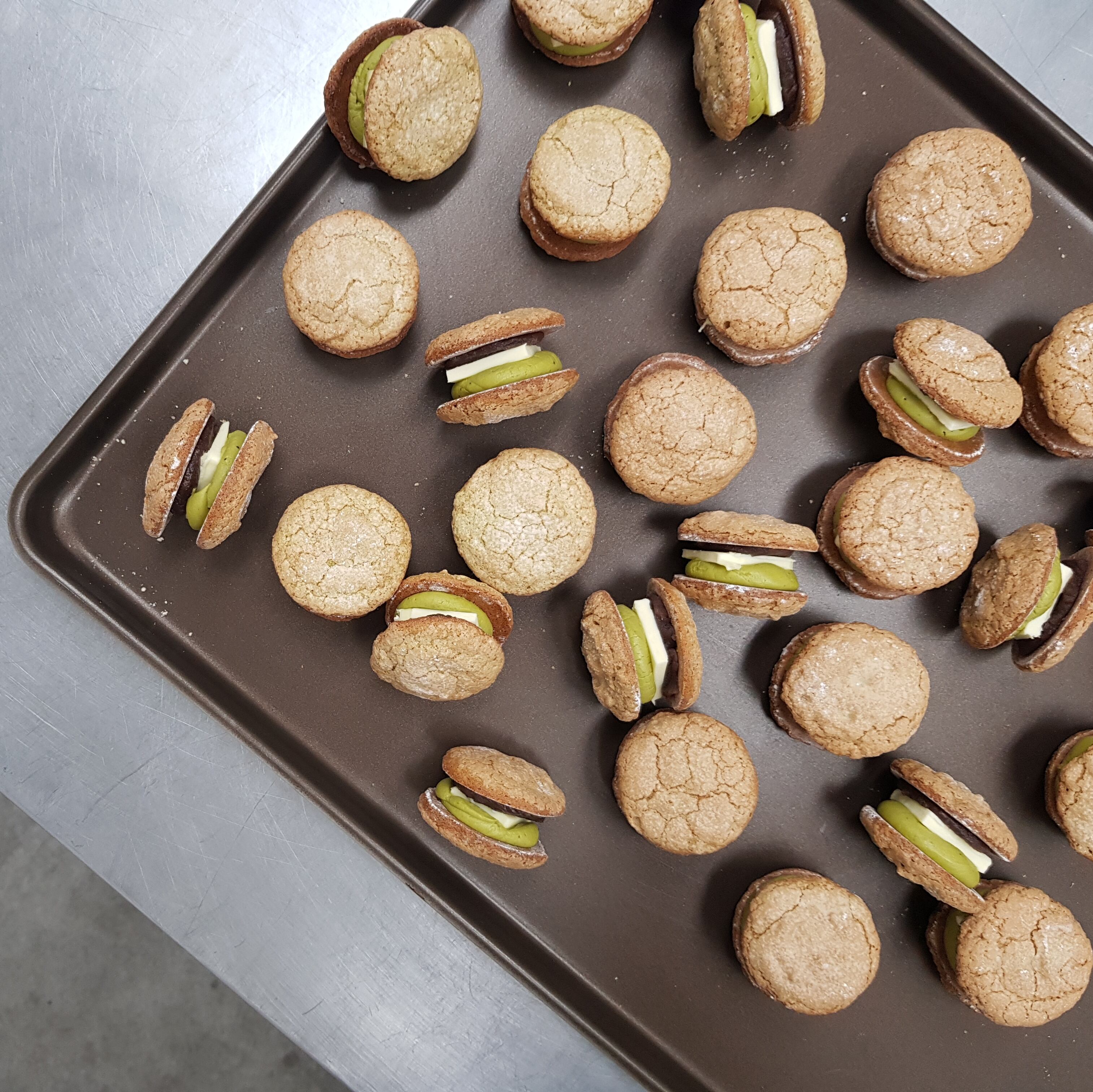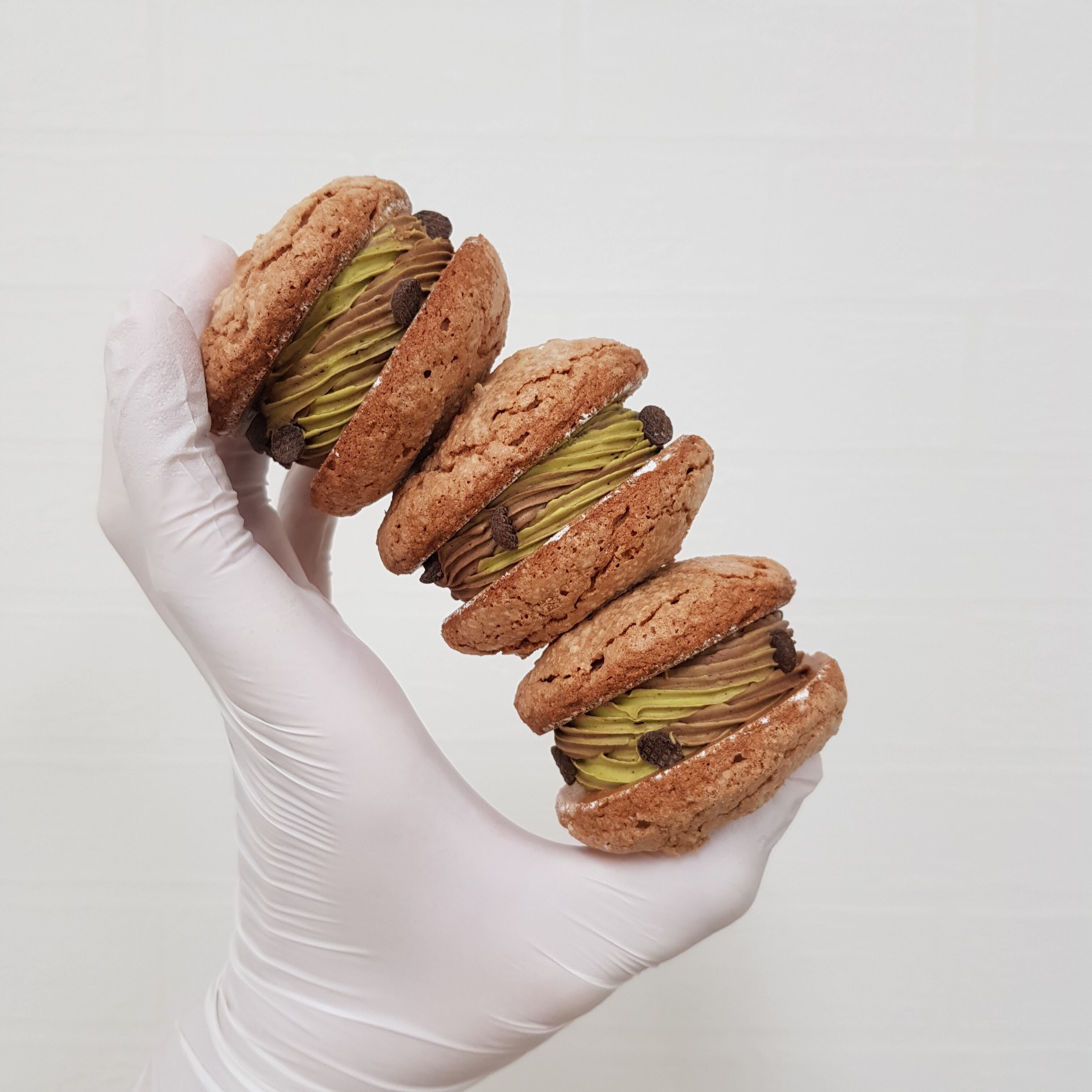 ダックワーズとマカロンの中間の形でもっと高級なクリームと材料を使っています。